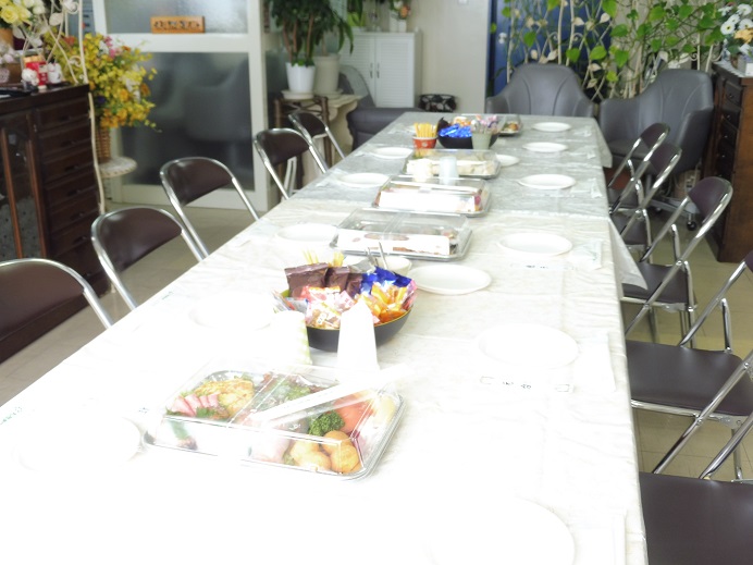 本日は、事務所内をちょっとだけいじってテーブルを繋げ、プチ懇親会をやっております。